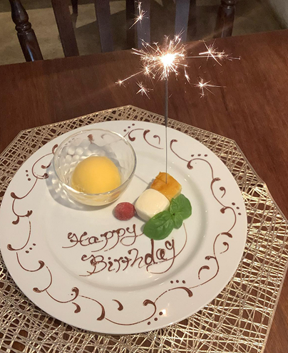 コースを事前にご予約いただいた方にはサービスでお誕生日や記念日などのお祝いプレートをご用意いたします。